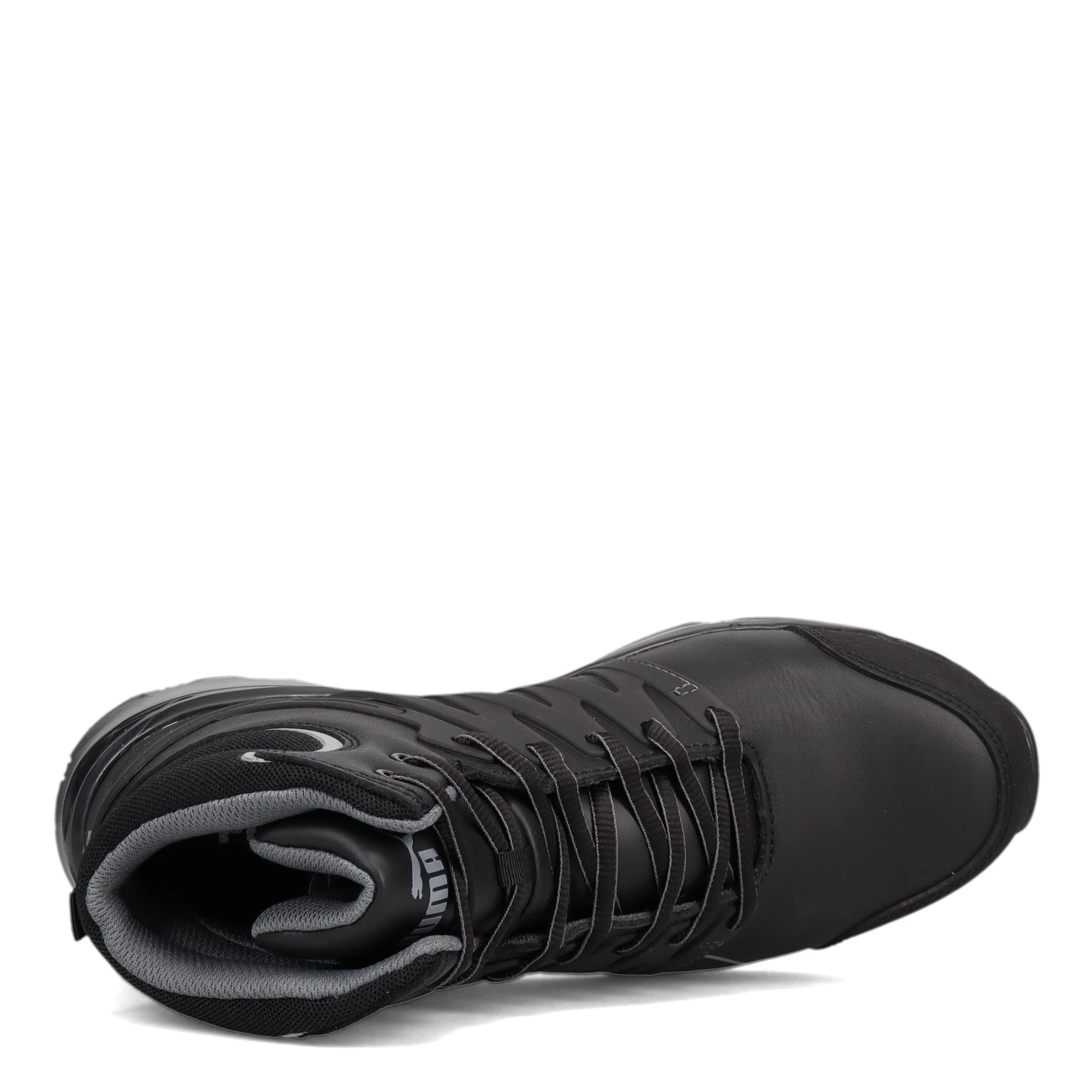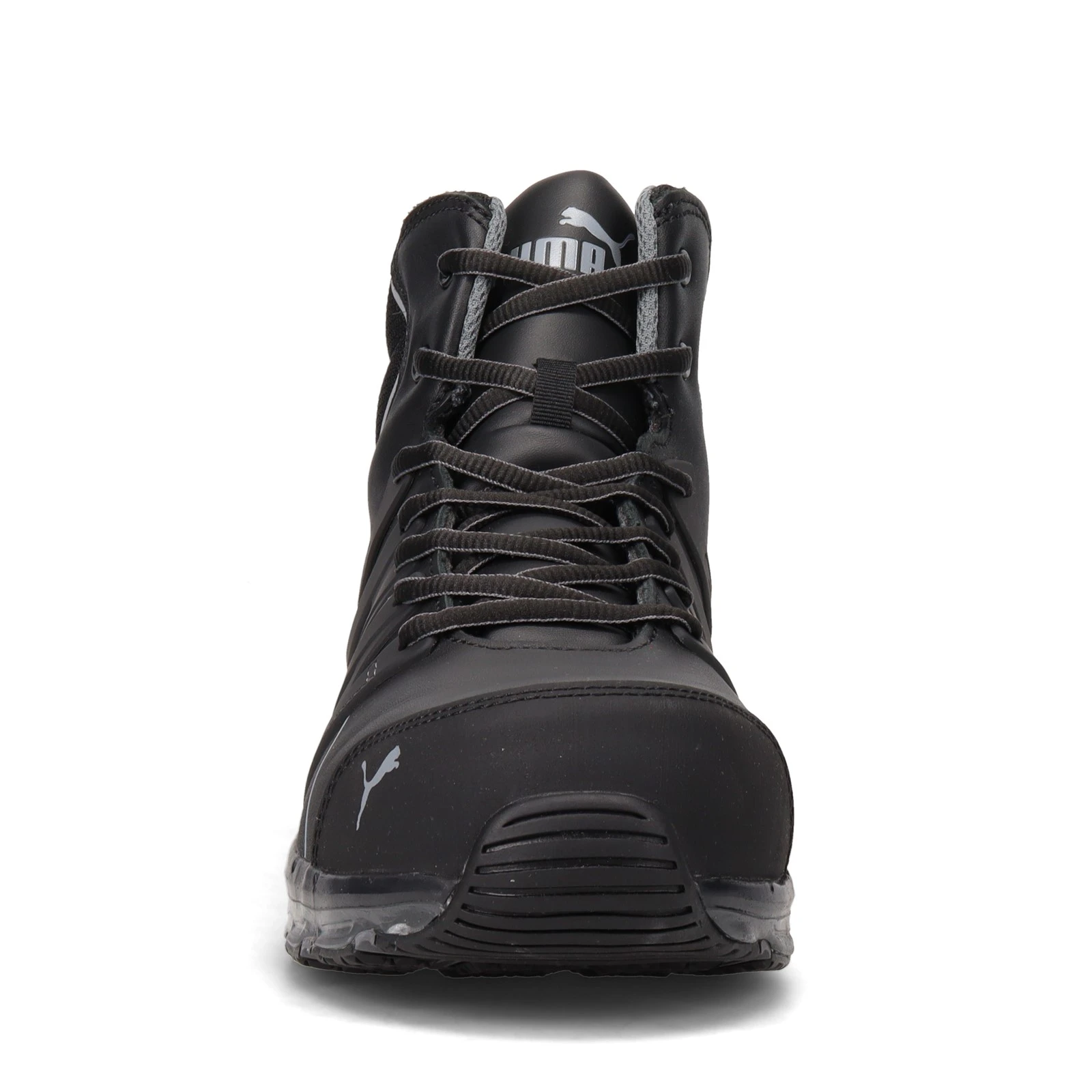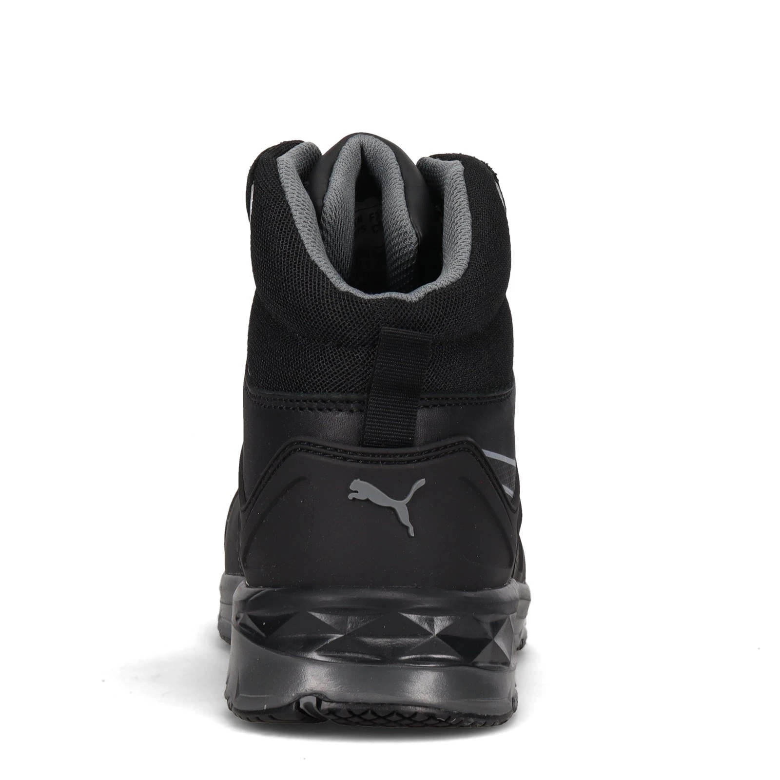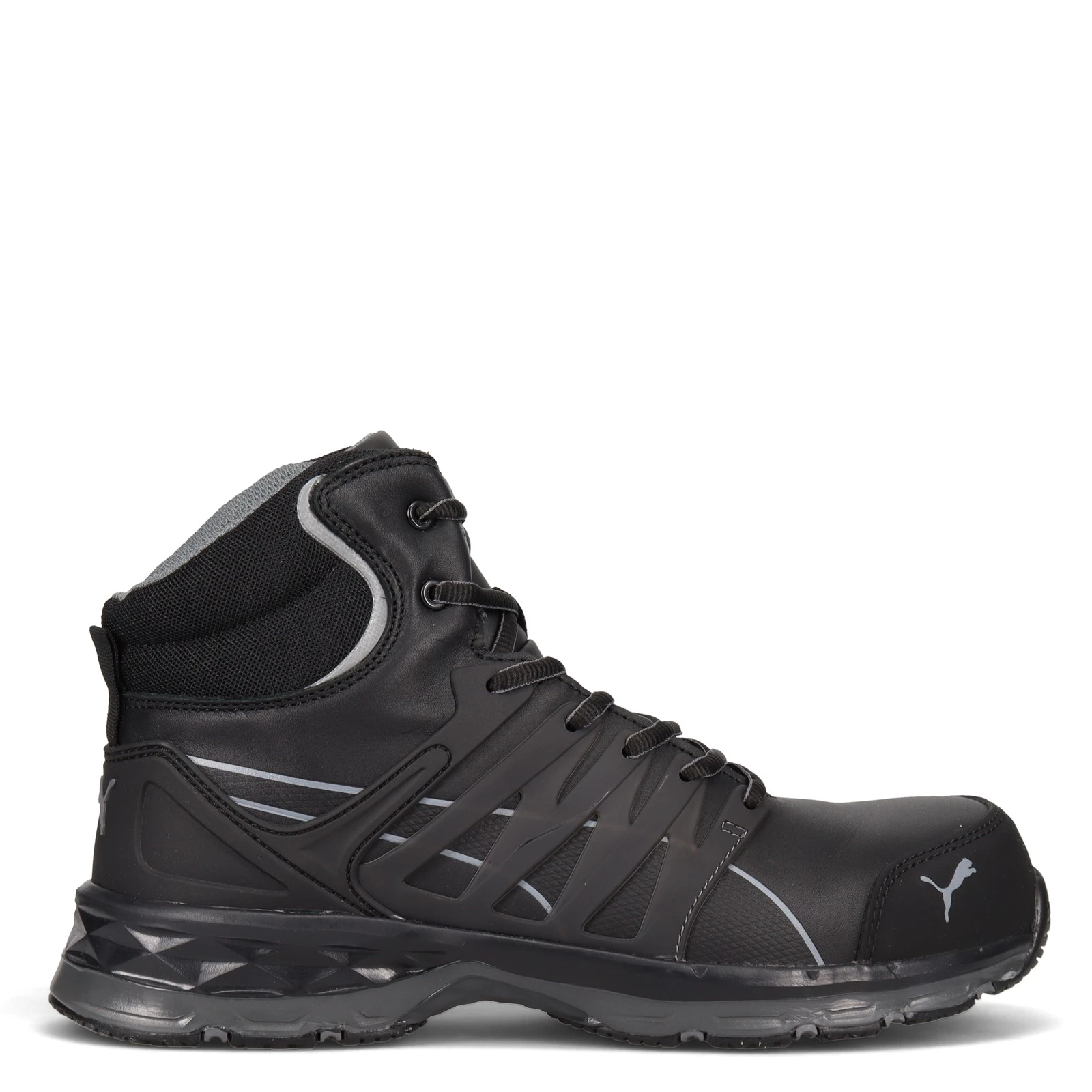 Men’s Puma Safety, Velocity 2.0 Mid Work Shoe. Feel protected and comfortable on the job in these mid top leather work shoes with a sturdy fiberglass toe. This athletic shoe inspired safety style also features a slip-resistant outsole which is also heat resistant and static dissipative.